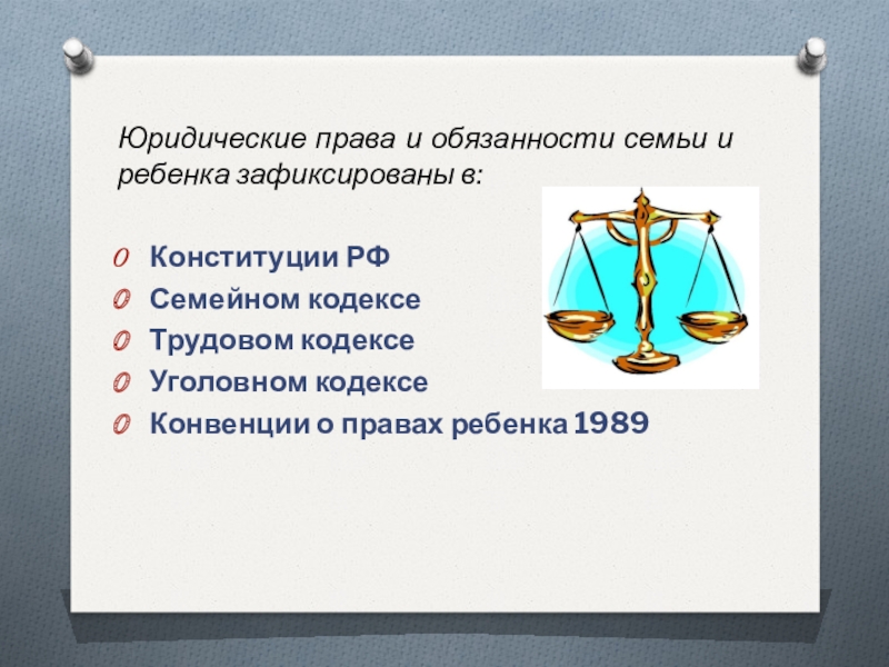 Слайд 3Юридические права и обязанности семьи и ребенка зафиксированы в: