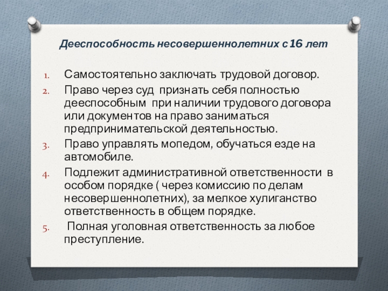 Дееспособность несовершеннолетних с 16 лет Самостоятельно заключать трудовой договор.Право через суд признать себя полностью дееспособным при наличии