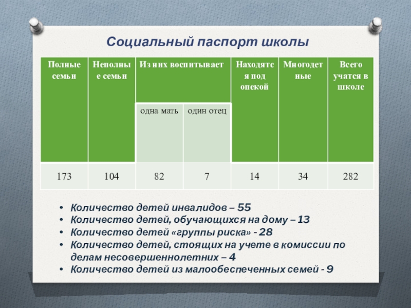 Социальный паспорт школыКоличество детей инвалидов – 55Количество детей, обучающихся на дому – 13Количество детей «группы риска» -