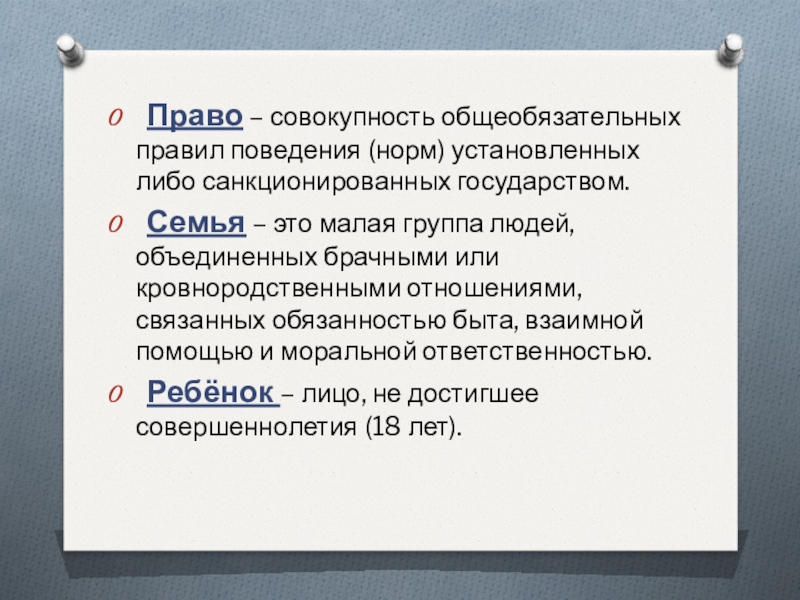 Право – совокупность общеобязательных правил поведения (норм) установленных либо санкционированных государством. Семья – это малая группа людей, объединенных брачными или кровнородственными отношениями, связанных обязанностью быта, взаимной помощью и моральной ответственностью. Ребёнок – лицо, не достигшее
