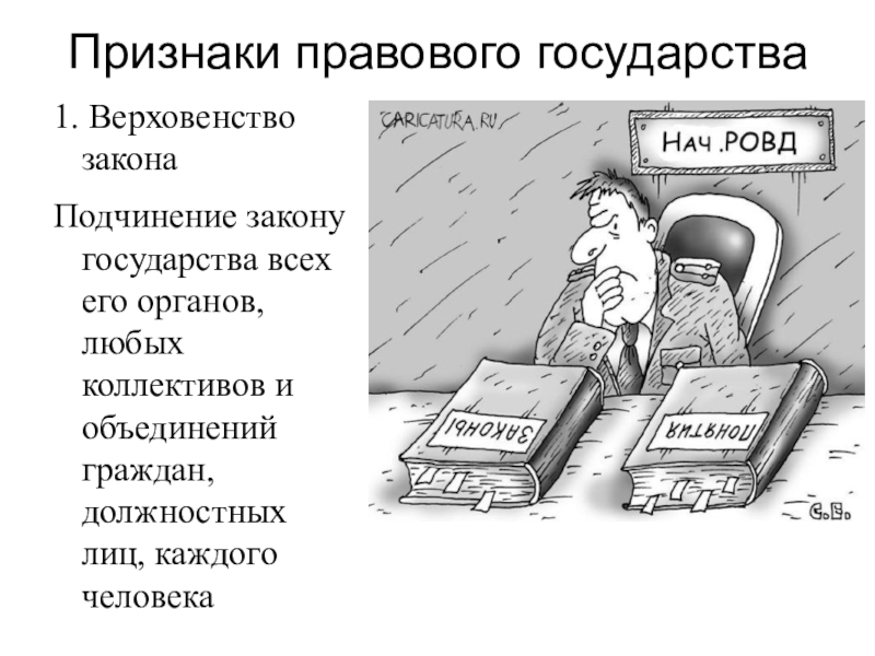 Признаки правового государства1. Верховенство законаПодчинение закону государства всех его органов, любых коллективов и объединений граждан, должностных лиц,