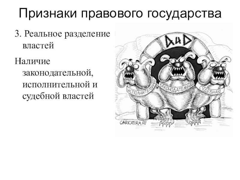 Признаки правового государства3. Реальное разделение властейНаличие законодательной, исполнительной и судебной властей