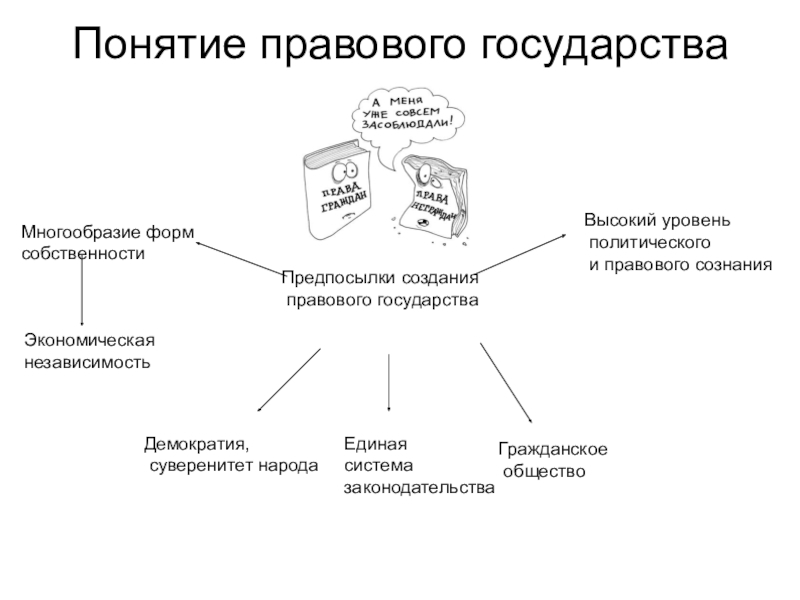Понятие правового государстваПредпосылки создания правового государстваМногообразие форм собственностиЭкономическая независимостьДемократия, суверенитет народаЕдиная система законодательстваГражданское обществоВысокий уровень политического и