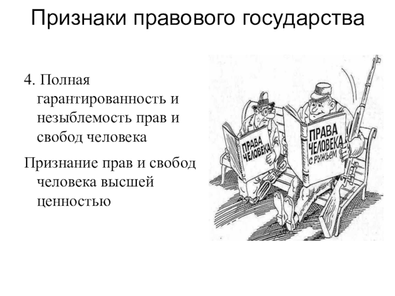 Признаки правового государства4. Полная гарантированность и незыблемость прав и свобод человекаПризнание прав и свобод человека высшей ценностью