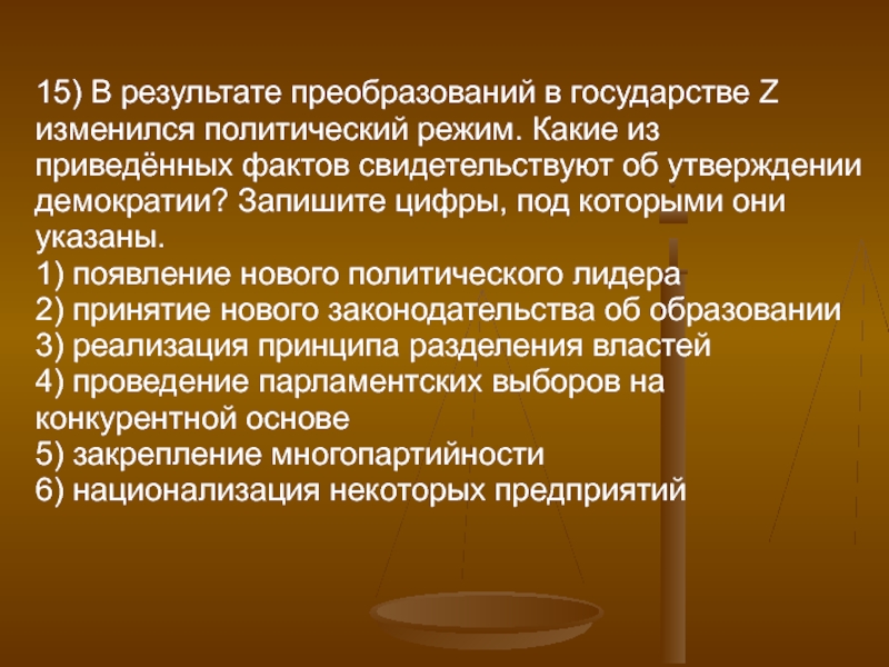 Слайд 5215) В результате преобразований в государстве Z изменился политический режим. Какие
