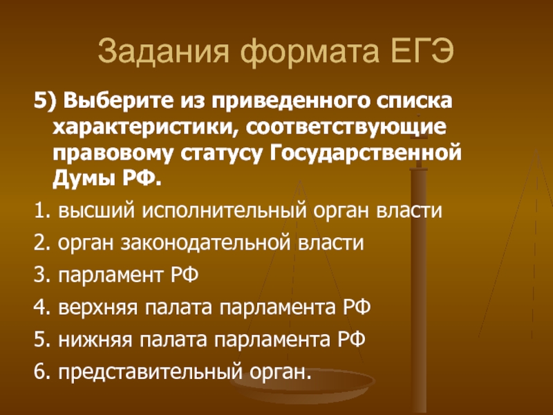 Слайд 425) Выберите из приведенного списка характеристики, соответствующие правовому статусу Государственной Думы