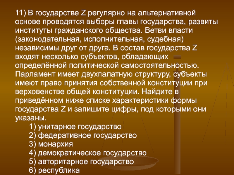 государства, развиты институты гражданского общества. Ветви власти (законодательная, исполнительная, судебная) независимы друг от друга. В состав государства Z входят несколько субъектов, обладающих определённой политической самостоятельностью. Парламент имеет двухпалатную структуру, субъекты имеют право принятия собственной конституции при верховенстве общей конституции. Найдите в приведённом ниже списке характеристики формы государства Z и запишите цифры, под которыми они указаны.
