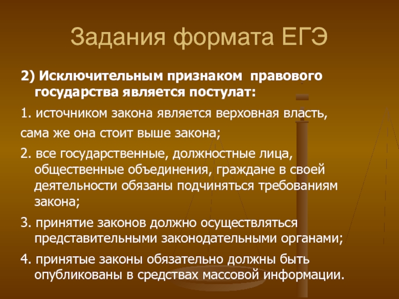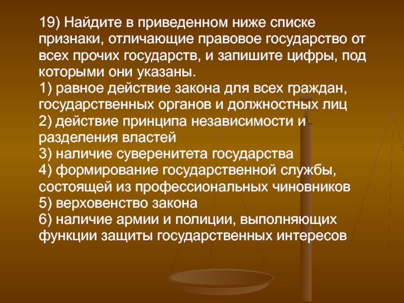 Слайд 5619) Найдите в приведенном ниже списке признаки, отличающие правовое государство от