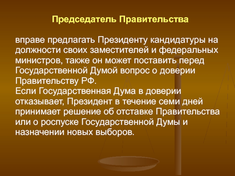 федеральных министров, также он может поставить перед Государственной Думой вопрос о доверии Правительству РФ.