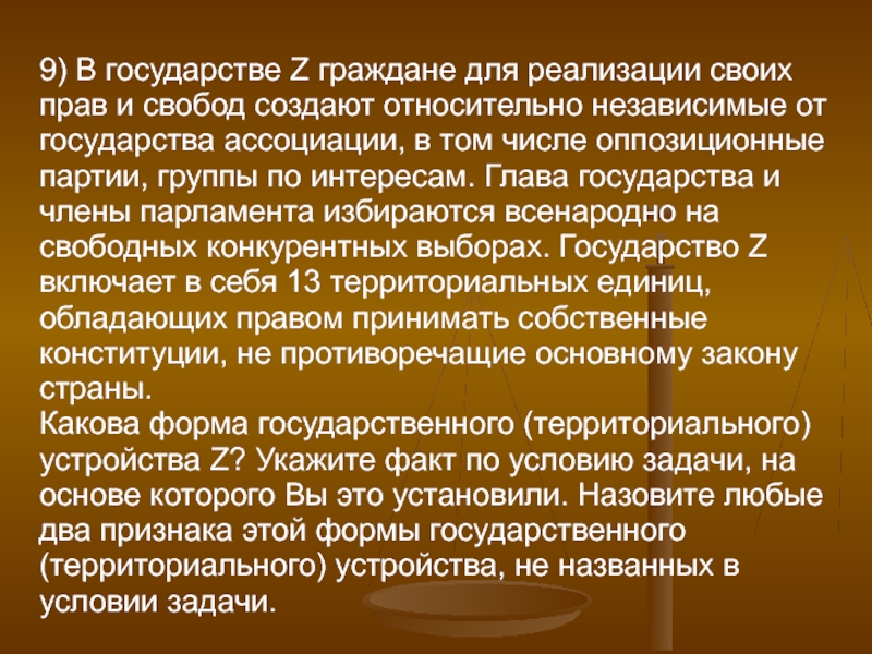 создают относительно независимые от государства ассоциации, в том числе оппозиционные партии, группы по интересам. Глава государства и члены парламента избираются всенародно на свободных конкурентных выборах. Государство Z включает в себя 13 территориальных единиц, обладающих правом принимать собственные конституции, не противоречащие основному закону страны.