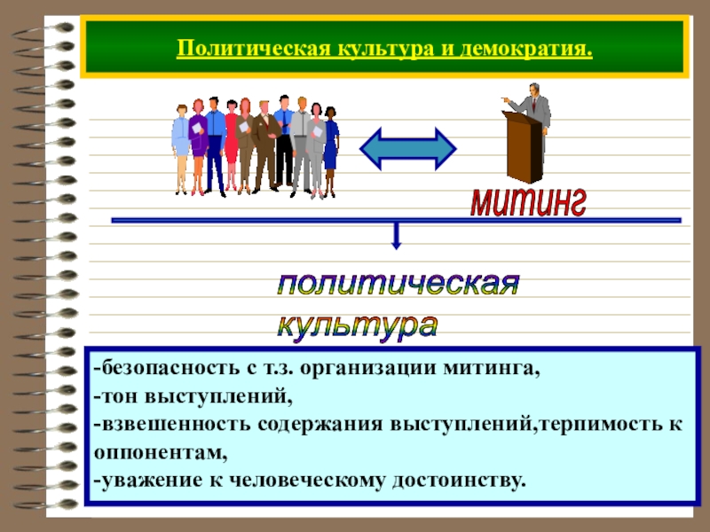 Политическая культура и демократия.-безопасность с т.з. организации митинга,-тон выступлений,-взвешенность содержания выступлений,терпимость коппонентам,-уважение к человеческому достоинству.