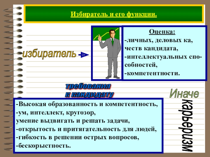 Избиратель и его функции.требования  к кандидату-Высокая образованность и компетентность,-ум, интеллект, кругозор,умение выдвигать и решать задачи,-открытость и