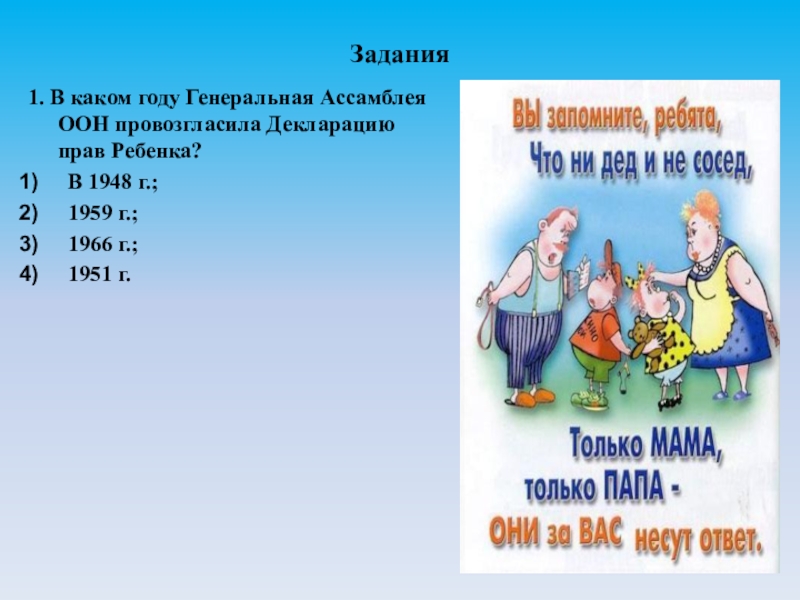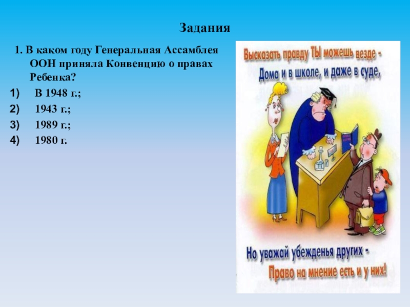 1. В каком году Генеральная Ассамблея ООН провозгласила Декларацию прав Ребенка?