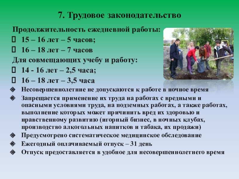 Запрещается применение их труда на работах с вредными и опасными условиями труда, на подземных работах, а также работах, выполнение которых может причинить вред их здоровью и нравственному развитию (игорный бизнес, в ночных клубах, производство алкогольных напитков и табака, их продажи)