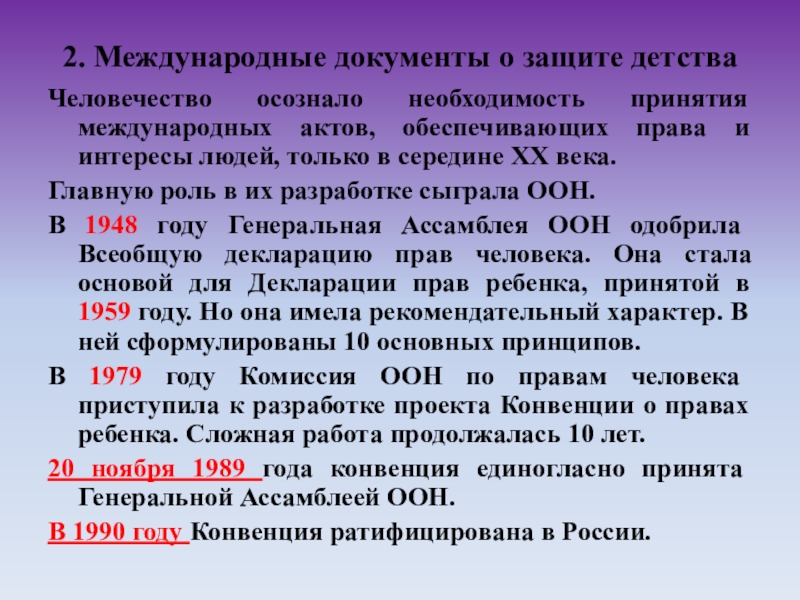 В 1948 году Генеральная Ассамблея ООН одобрила Всеобщую декларацию прав человека. Она стала основой для Декларации прав ребенка, принятой в 1959 году. Но она имела рекомендательный характер. В ней сформулированы 10 основных принципов.