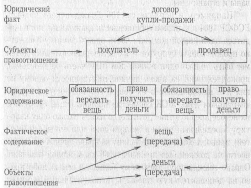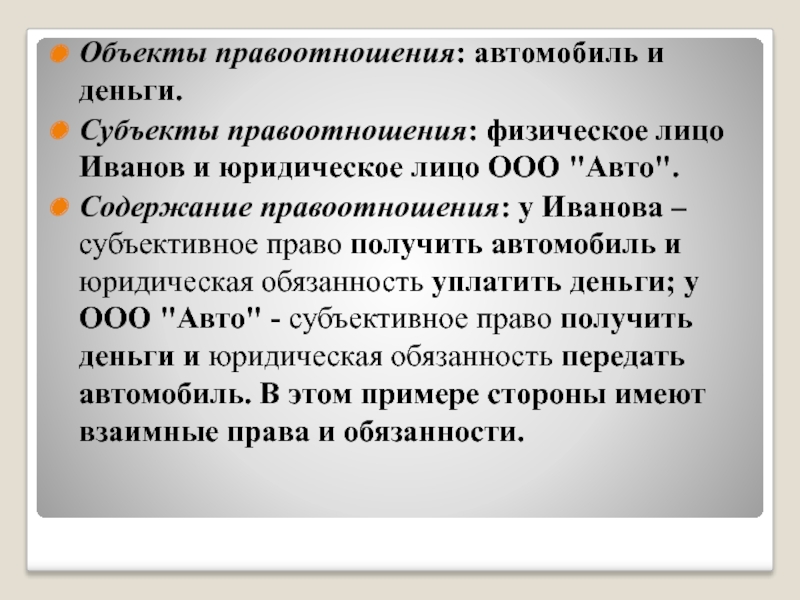 Содержание правоотношения: у Иванова – субъективное право получить автомобиль и юридическая обязанность уплатить деньги; у ООО "Авто" - субъективное право получить деньги и юридическая обязанность передать автомобиль. В этом примере стороны имеют взаимные права и обязанности.