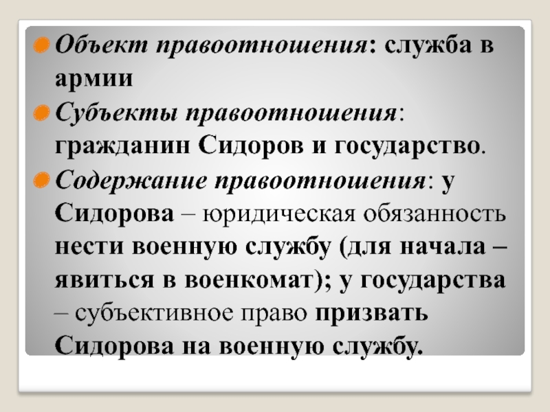 Объект правоотношения: служба в армии Субъекты правоотношения: гражданин Сидоров и государство. Содержание правоотношения: у Сидорова – юридическая