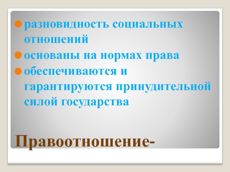Правоотношение-разновидность социальных отношенийоснованы на нормах праваобеспечиваются и гарантируются принудительной силой государства