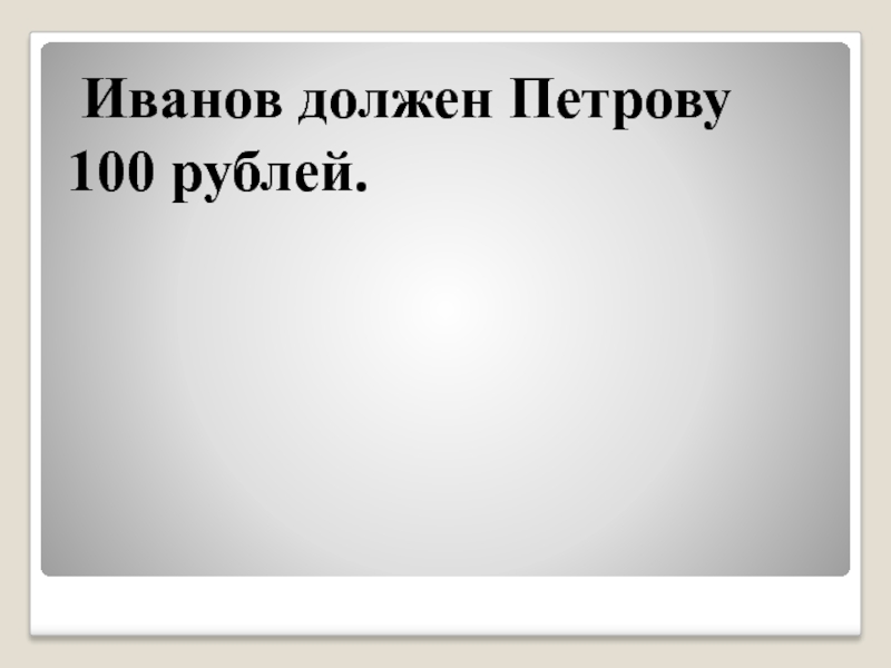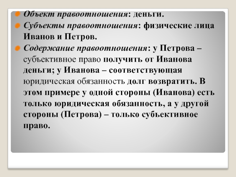 Объект правоотношения: деньги. Субъекты правоотношения: физические лица Иванов и Петров. Содержание правоотношения: у Петрова – субъективное право