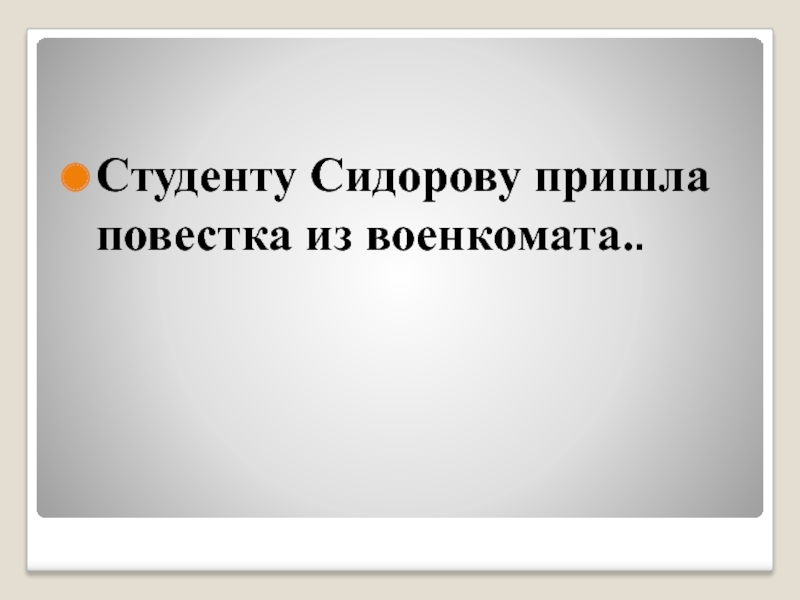 Содержание правоотношения: у Сидорова – юридическая обязанность нести военную службу (для начала – явиться в военкомат); у государства – субъективное право призвать Сидорова на военную службу.