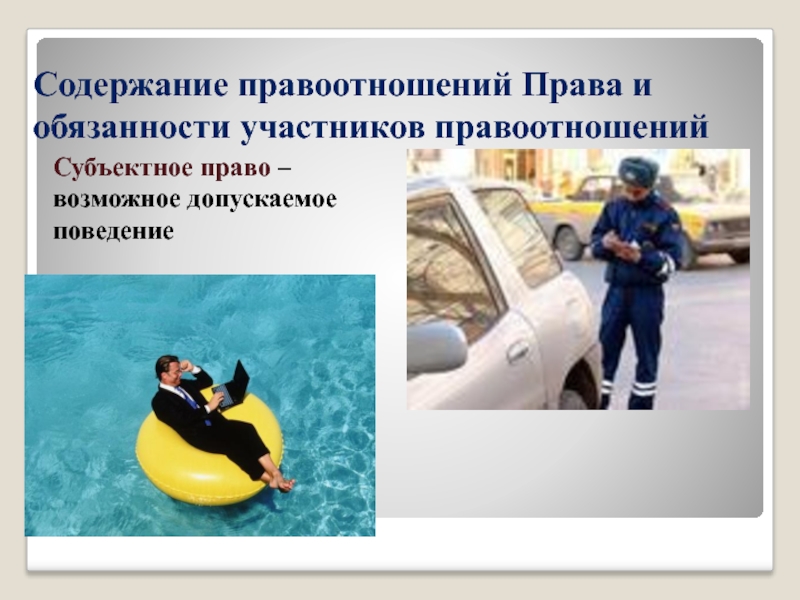 Содержание правоотношений Права и обязанности участников правоотношенийСубъектное право – возможное допускаемое поведениеЮридическая обязанность – требуемое поведение