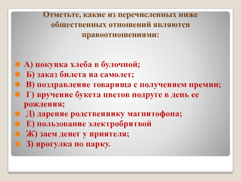 Слайд 5Отметьте, какие из перечисленных ниже общественных отношений являются правоотношениями: