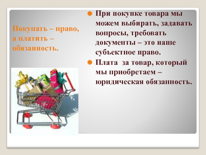 Покупать – право,  а платить – обязанность.При покупке товара мы можем выбирать, задавать вопросы, требовать документы