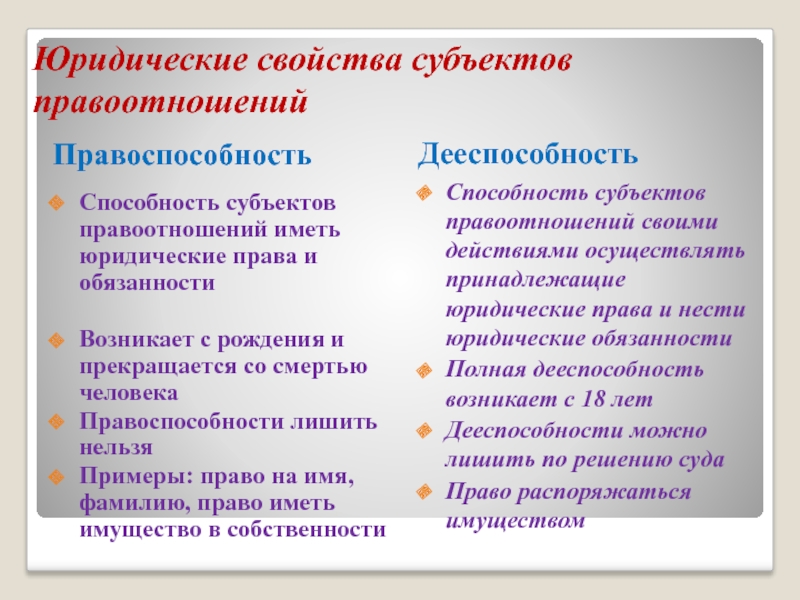 Юридические свойства субъектов правоотношенийПравоспособность ДееспособностьСпособность субъектов правоотношений иметь юридические права и обязанностиВозникает с рождения и прекращается со