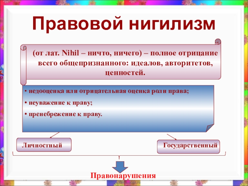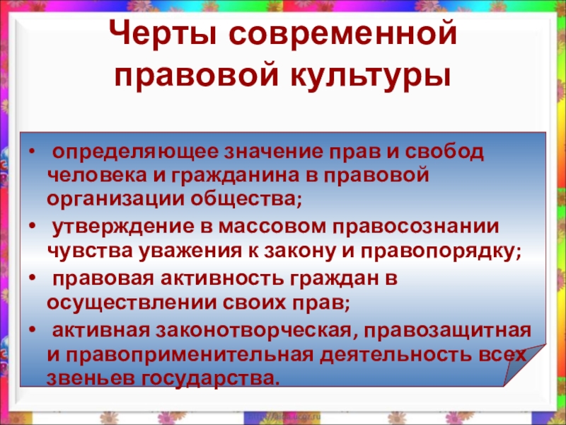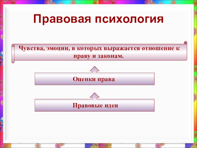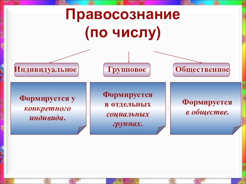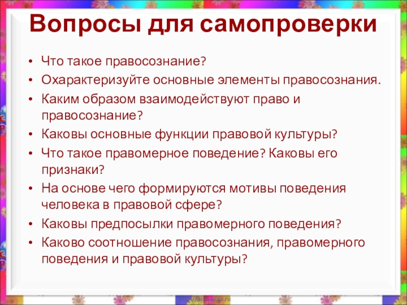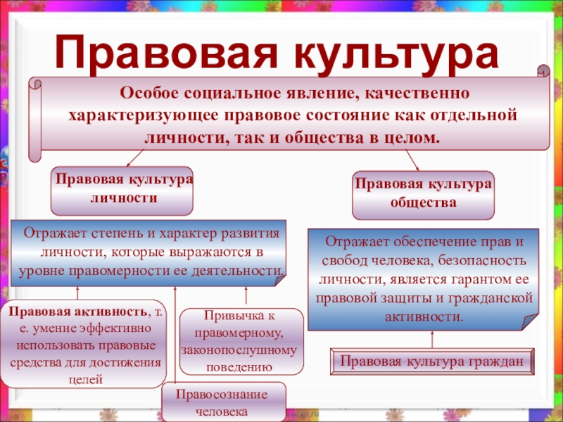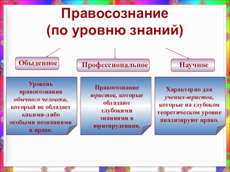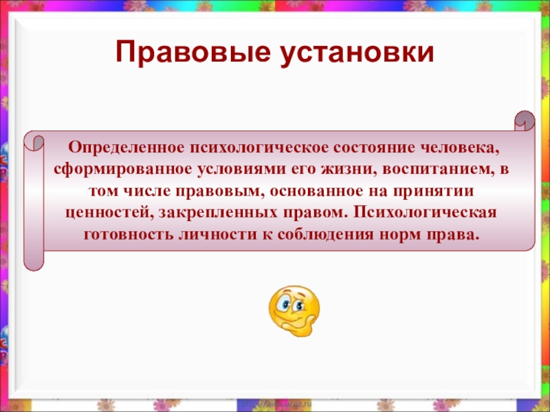 Осознание юридических прав и обязанностей, усвоение юридических норм личностью.