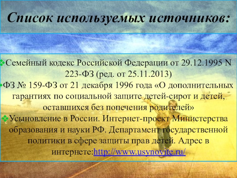 Усыновление в России. Интернет-проект Министерства образования и науки РФ. Департамент государственной политики в сфере защиты прав детей. Адрес в интернете:http://www.usynovite.ru/