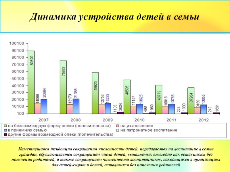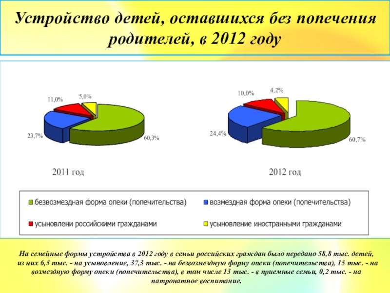 устройства в 2012 году в семьи российских граждан было передано 58,8 тыс. детей, из них 6,5 тыс. - на усыновление, 37,3 тыс. - на безвозмездную форму опеки (попечительства), 15 тыс. - на возмездную форму опеки (попечительства), в том числе 13 тыс. - в приемные семьи, 0,2 тыс. - на патронатное воспитание.