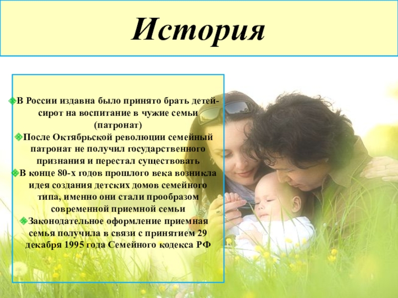 Законодательное оформление приемная семья получила в связи с принятием 29 декабря 1995 года Семейного кодекса РФ
