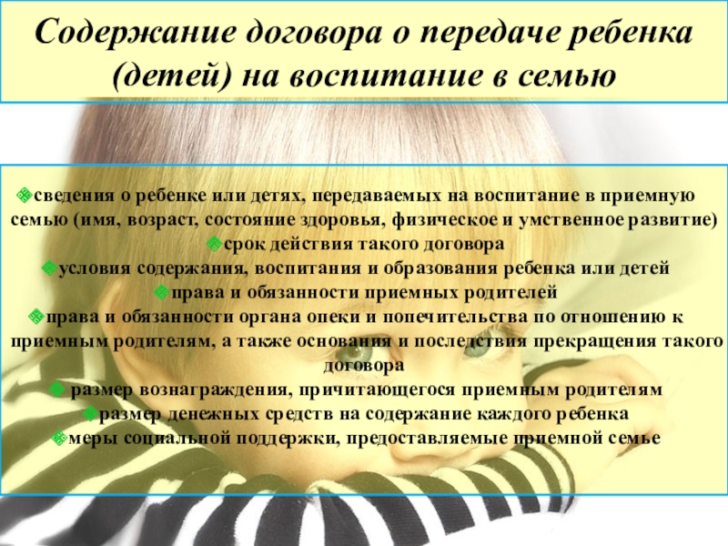 Слайд 8Содержание договора о передаче ребенка (детей) на воспитание в семью