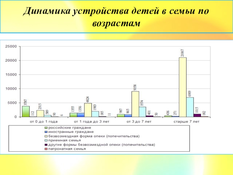 Слайд 15Динамика устройства детей в семьи по возрастам