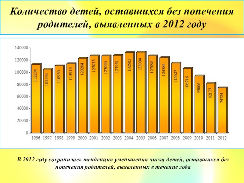 Слайд 12Количество детей, оставшихся без попечения родителей, выявленных в 2012 году
