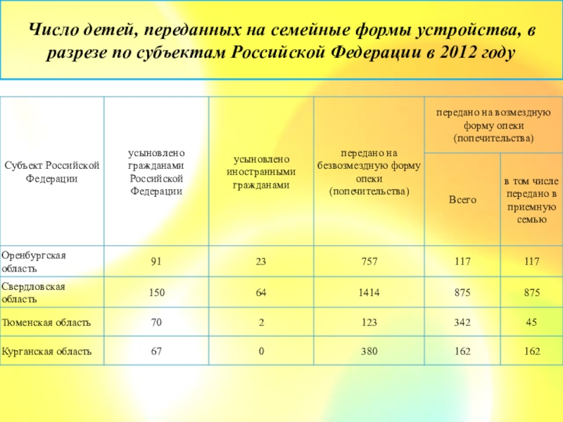 Слайд 13Устройство детей, оставшихся без попечения родителей, в 2012 году