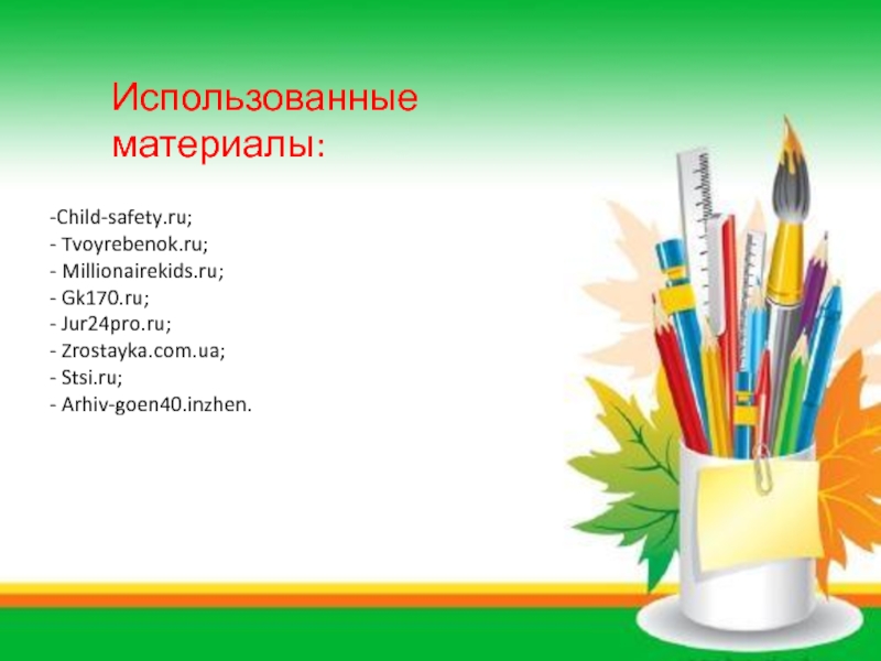 Использованные материалы:Child-safety.ru; Tvoyrebenok.ru; Millionairekids.ru; Gk170.ru; Jur24pro.ru; Zrostayka.com.ua; Stsi.ru; Arhiv-goen40.inzhen.