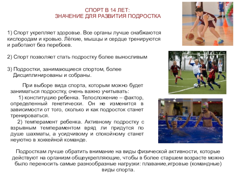 Подросткам лучше обратить внимание на виды физической активности, которые действуют на организм общеукрепляющие, чтобы в более старшем возрасте можно было переносить самые разнообразные нагрузки: плавание,игровые (командные) виды спорта.