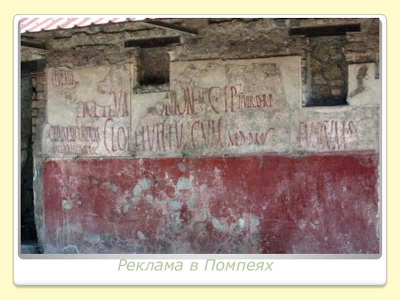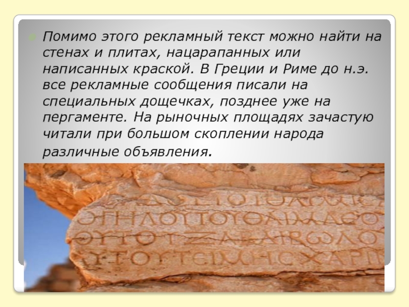 Слайд 5Помимо этого рекламный текст можно найти на стенах и плитах, нацарапанных