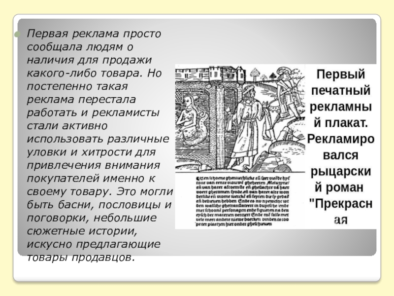 Слайд 13Первая реклама просто сообщала людям о наличия для продажи какого-либо товара.