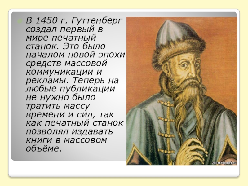было началом новой эпохи средств массовой коммуникации и рекламы. Теперь на любые публикации не нужно было тратить массу времени и сил, так как печатный станок позволял издавать книги в массовом объёме.