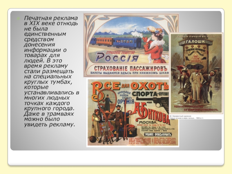 Слайд 17Печатная реклама в XIX веке отнюдь не была единственным средством донесения