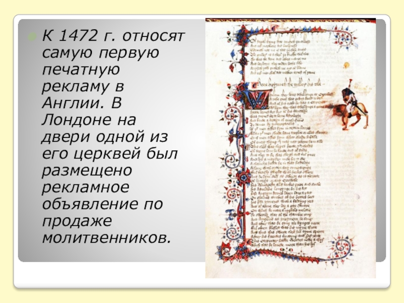 Слайд 11К 1472 г. относят самую первую печатную рекламу в Англии. В