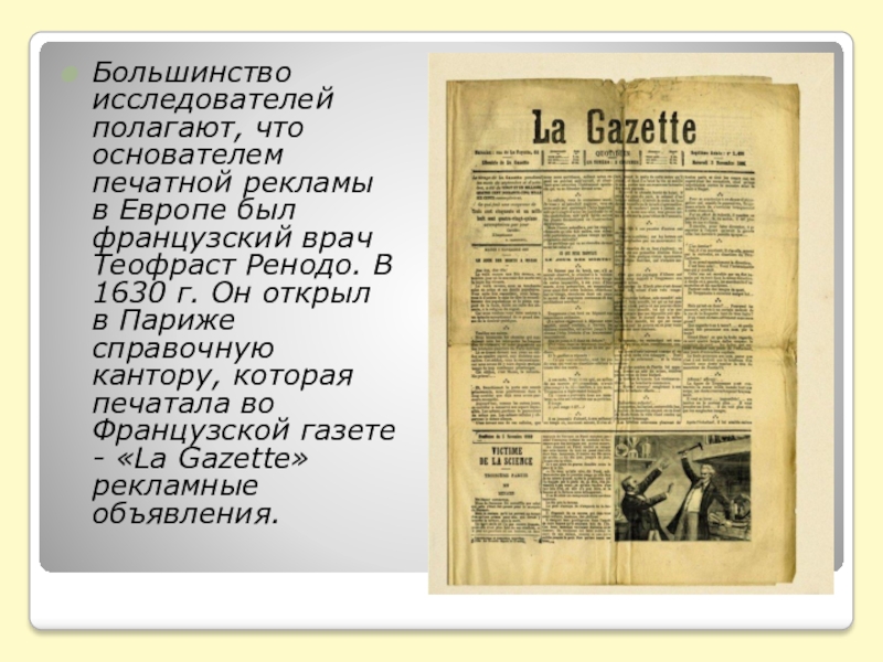 Слайд 12Большинство исследователей полагают, что основателем печатной рекламы в Европе был французский