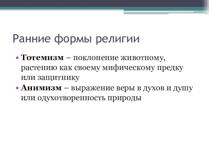 Ранние формы религииТотемизм – поклонение животному, растению как своему мифическому предку или защитникуАнимизм – выражение веры в