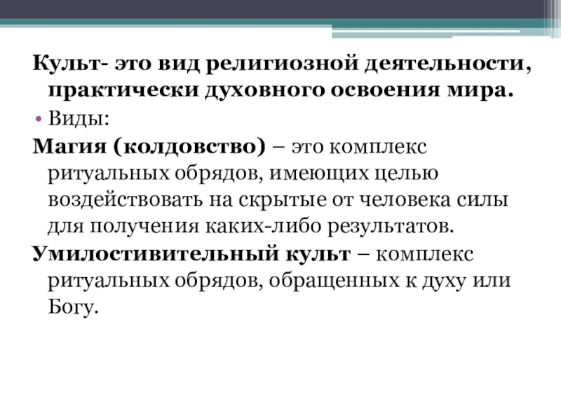 Культ- это вид религиозной деятельности, практически духовного освоения мира.Виды:Магия (колдовство) – это комплекс ритуальных обрядов, имеющих целью