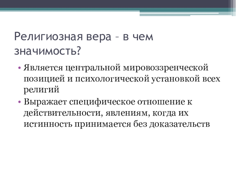 Религиозная вера – в чем значимость?Является центральной мировоззренческой позицией и психологической установкой всех религийВыражает специфическое отношение к