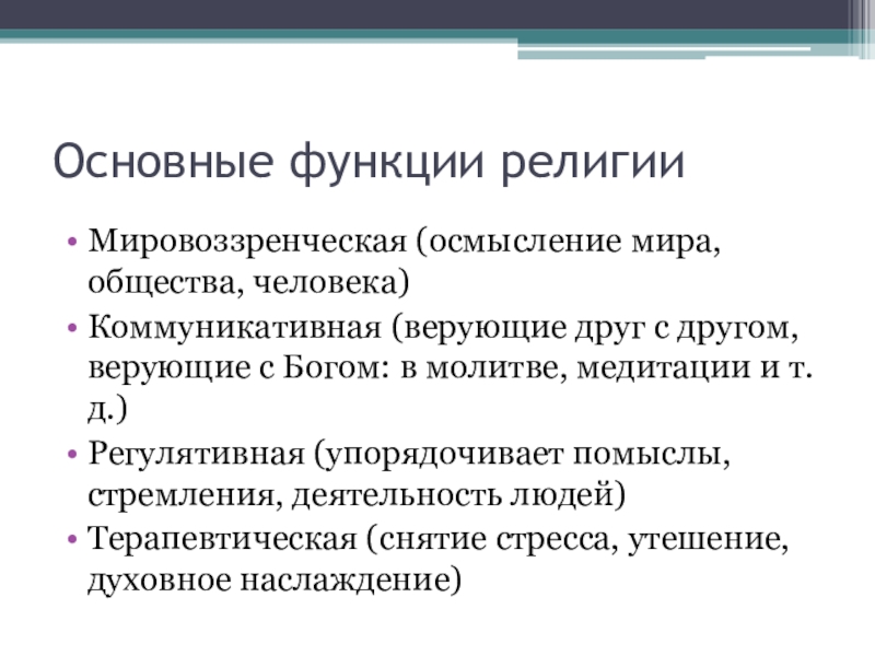 Основные функции религииМировоззренческая (осмысление мира, общества, человека)Коммуникативная (верующие друг с другом, верующие с Богом: в молитве, медитации