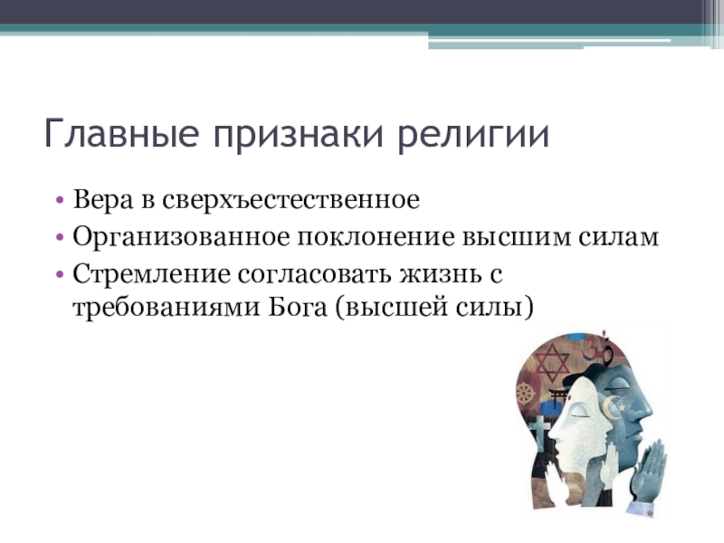 Главные признаки религииВера в сверхъестественноеОрганизованное поклонение высшим силамСтремление согласовать жизнь с требованиями Бога (высшей силы)