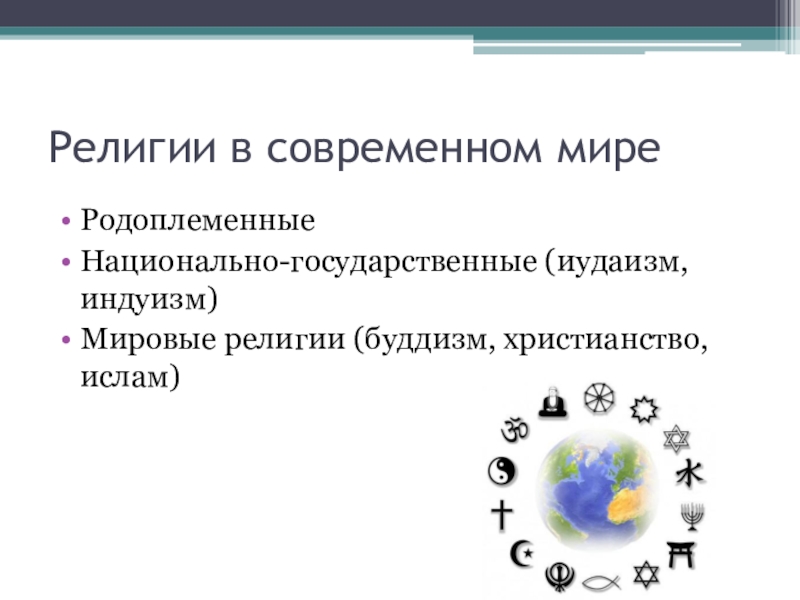 Религии в современном миреРодоплеменныеНационально-государственные (иудаизм, индуизм)Мировые религии (буддизм, христианство, ислам)